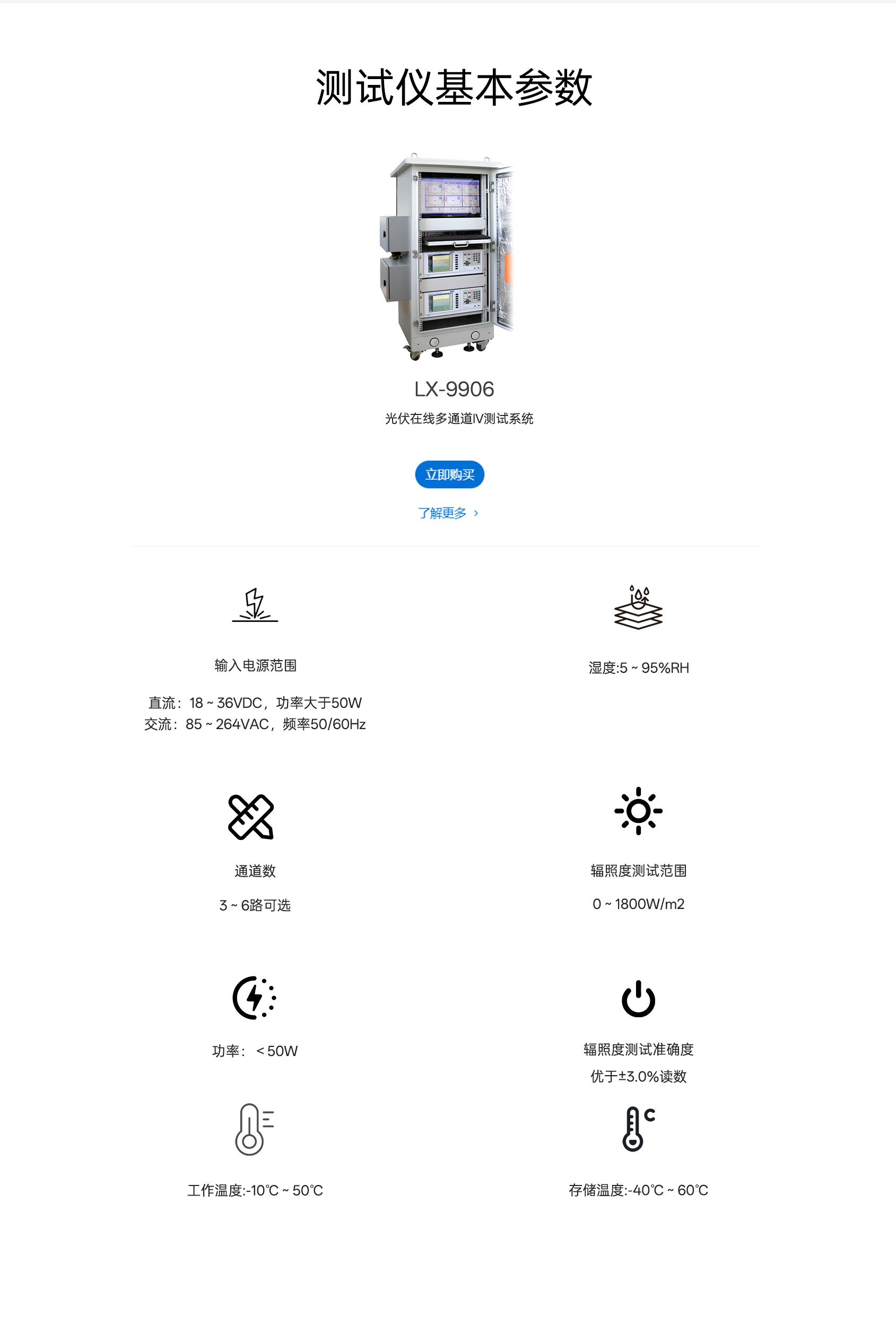 LX9906光伏在線多通道IV測(cè)試系統(tǒng)適應(yīng)目前戶外光伏組件真實(shí)發(fā)電量測(cè)試比對(duì),適應(yīng)最新的IEC61853光伏組件發(fā)電量測(cè)試要求。滿足光伏組件設(shè)計(jì)制造企業(yè)及光伏電站系統(tǒng)集成商對(duì)戶外光伏組件的評(píng)測(cè)需求。