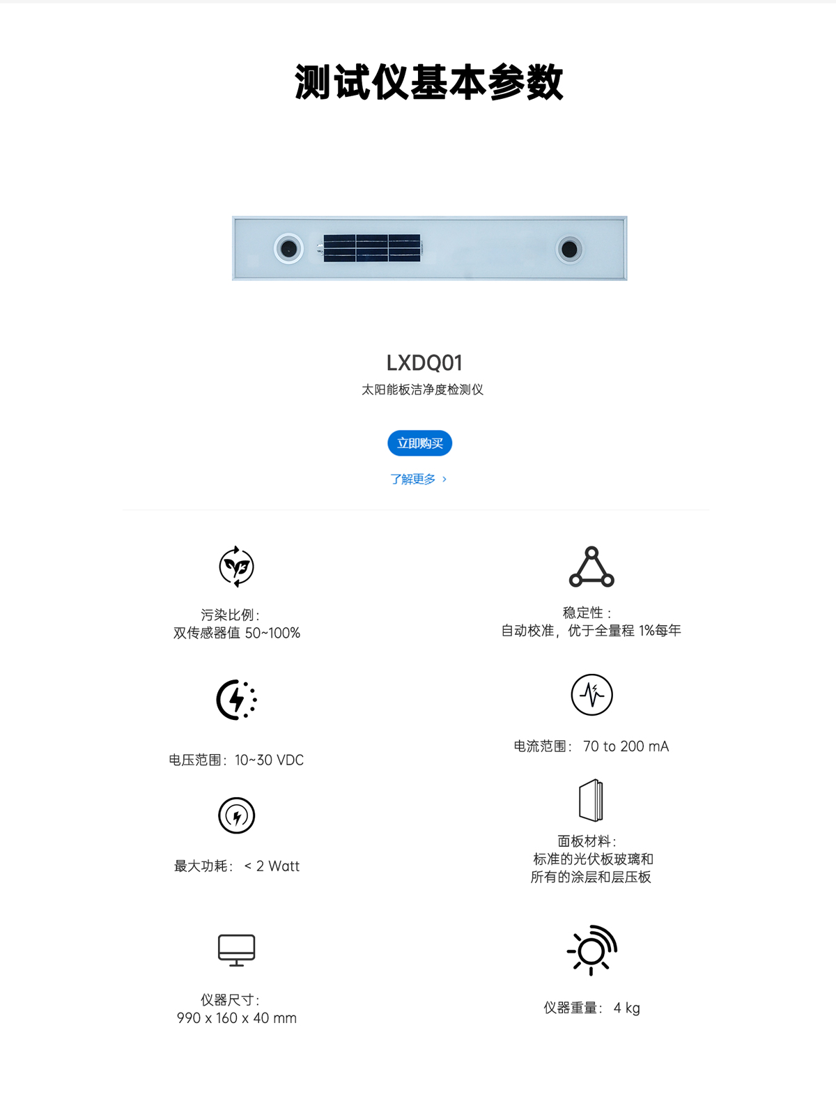 因?yàn)榇笮凸夥娬驹谡麄€(gè)園區(qū)中有不同的污染率,所以IEC 61724-1 標(biāo)準(zhǔn)中要求多點(diǎn)測(cè)量。與傳統(tǒng)系統(tǒng)相比,太陽能板污染指數(shù)檢測(cè)儀 LX-DQ01的采購成本、安裝和維護(hù)成本要低得多,并且更加客觀和準(zhǔn)確。