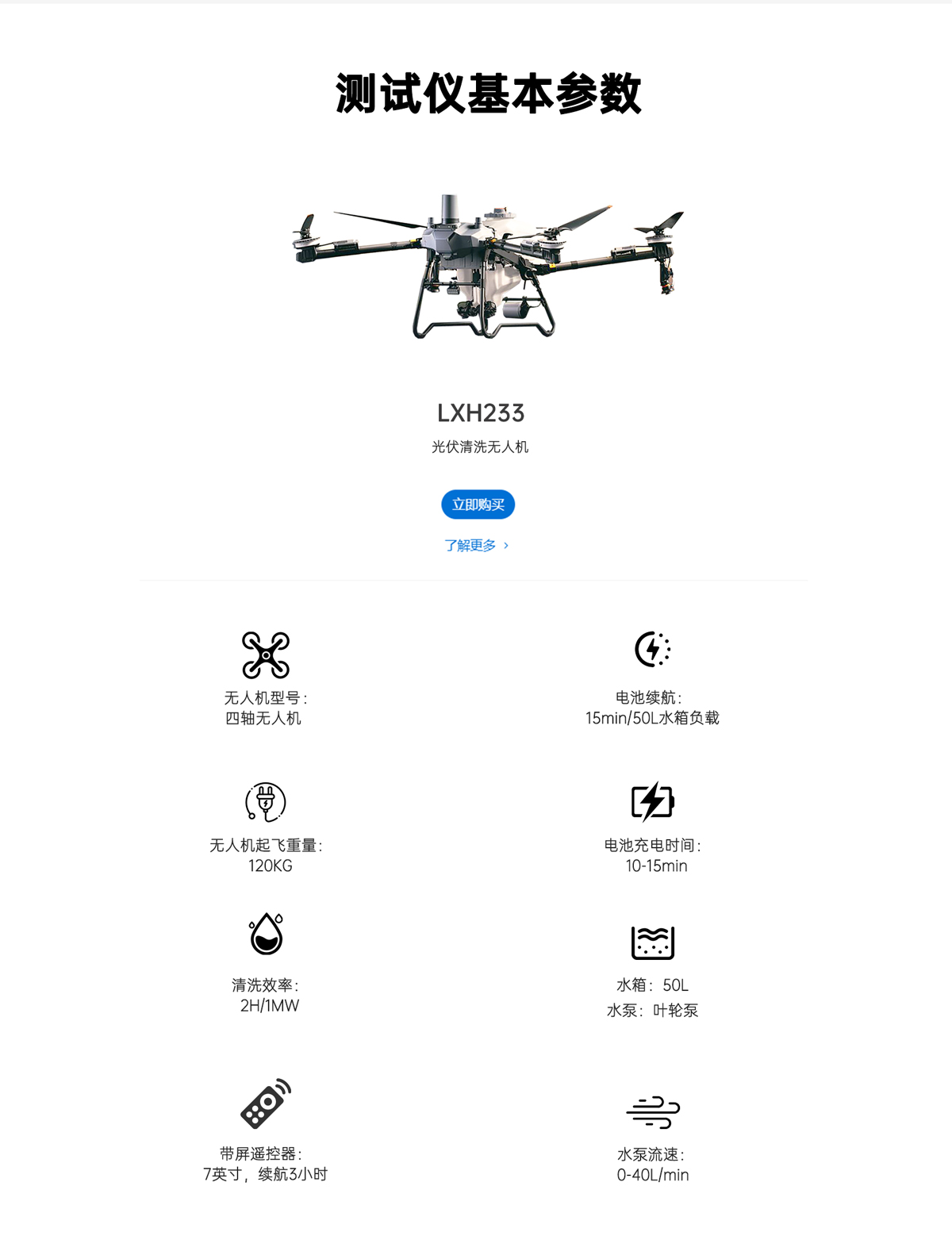 LXH233可載重60kg吊裝,不僅可滿?光伏?洗?常使?,同時可拓展,光伏組件吊裝以及設備裝置的吊裝?作使?,具備更多的應?場景。